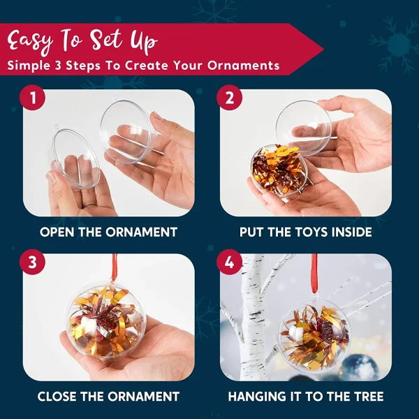 • These hanging Christmas ornaments are shatterproof as it was made out of heavy-duty polystyrene material. This is easy to use as each sphere can be separated into two parts in order to close and open it. Put your favorite gifts inside or decorations! Hang this on the tree. Even if the ornaments are crushed, they will not have any harmful effects as this is safe for kids and even pets around.