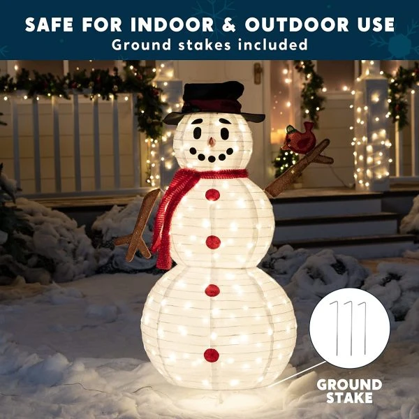 • Our Christmas light-up yard snowman includes a 3.8 Feet Tall Pop-Up Snowman with 160 LED Warm White Lights in Clear Wire and 4 Metal Stakes. Made of Metal Frame and Tinsel Fabric.