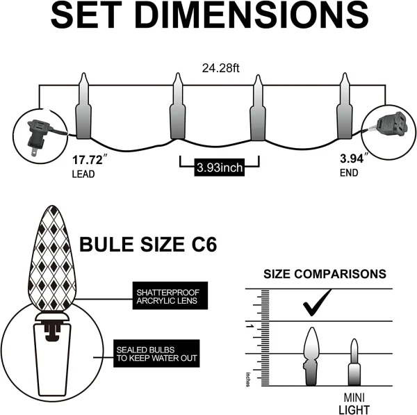 • C6 LED Christmas string lights include 2 packs of 70-count Warm LED light strings. Each set measures around 24.28 FT with Green wire. whole Lighted Length coverage of 22.47 FT. The total length is 48.56 FT. Also equipped with a C6 bulb (with 2 extra bulbs)type for more efficient, bright, and energy-saving lighting.