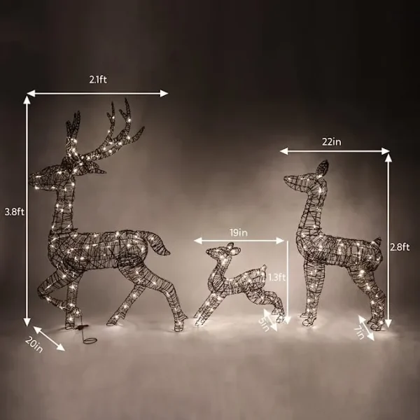 - SUPER VALUE PACK. Our 3 Packs Christmas LED Yard Lights includes 3 Rattan Reindeers with 160 LED Warm White Lights in Clear Wire, Metal Stakes and Zip Ties. Made of Rattan Material. They are 1.3 FT (Fawn), 2.8 FT (Doe), and 3.8 FT (Buck) Feet Tall.