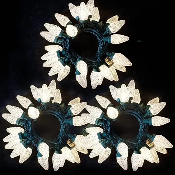 • C9 multicolor LED Christmas lights include a 3-pack 25-count Multicolor and Warm White LED string light. Each set measures around 16.4 FT with Green wire. whole Lighted Length coverage of 15.75 FT. The total length is 49.2 FT and 75 counts.