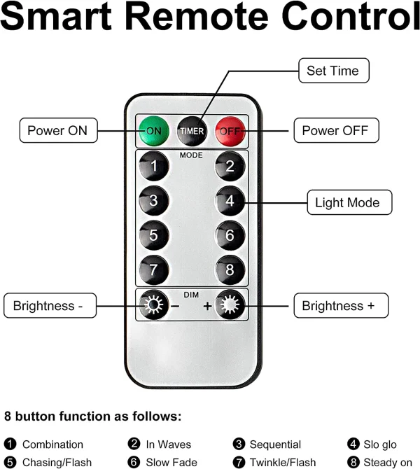 β’ Equipped with a remote control to easily change the string lightsβ lighting modes, the brightness of the led string (using the DIM β or + button), or turn on/off the string lights. It has 8 modes as Combination, In Wave, Sequential, Slo Glo, Chasing/Flash, Slow Fade, Twinkle/Flash, and Steady which can be selected at any time. Also got a 6Hr Timer feature that is convenient if you donβt have time to always check the lights