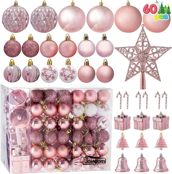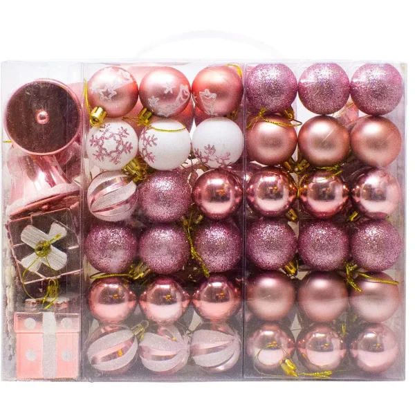 The rosegold and white assorted Christmas ornaments set comes with 12 Red Glitter Balls, 12 Red Shiny Balls, 6 Red Matte Balls, 6 Christmas Trees, 4 Swirls Balls, 4 Bells, 4 Gift Boxes, 3 Snowflake Balls, 3 Christmas Tree Balls, 3 White Snowflakes, 3 Red Snowflakes, 3 Diamond Plaid Balls, 2 Candy Canes, and 1 Red Star Tree Topper. Apart from its durability, the exquisite design adds up flavor to your decorations. These hanging Christmas ornaments are shatterproof because they were made with sturdy and eco-friendly plastic materials. Even if the ornaments are crushed. These colorful Christmas ball ornaments will captivate both children and adults as well as your neighbors!