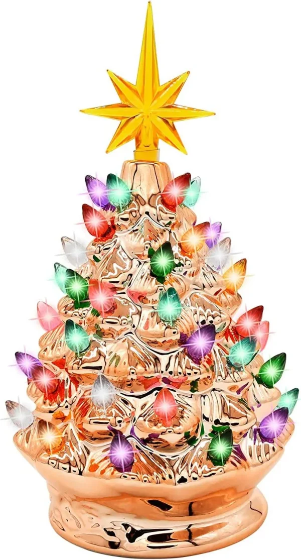 • Christmas tree body is made of glossy ceramic, with multicolored bulbs, and a transparent star topper. Plus 1 extra yellow star topper and 10 bulbs