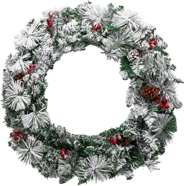 • Our artificial christmas wreath Decor includes 1 Pcs Snow Flocked Christmas Wreath with 24″ in diameter. These are equipped with 8 red berries, 8 pine cones, 1 metal hanger and 50 LED string lights.