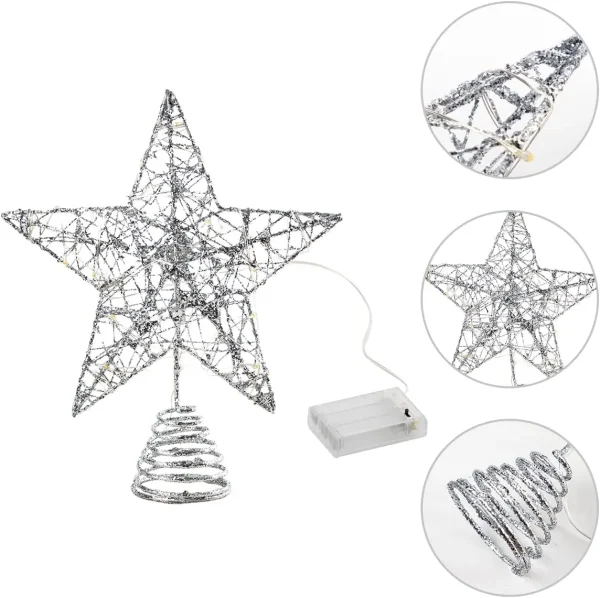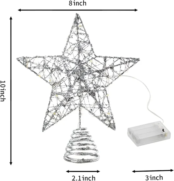 • This Star Tree Topper is perfectly coated in Silver with shining glitter around it. When the built-in Warm White LED is lit, its glittery coat does shine brightly along with the lights.