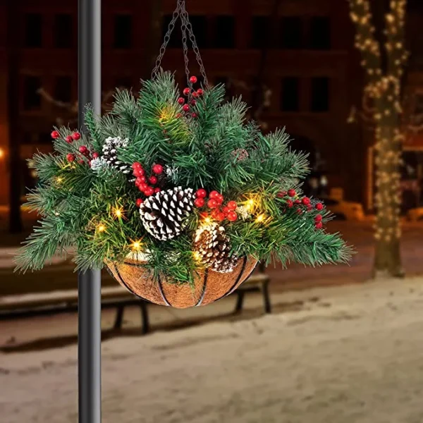 • Pre lit artificial Christmas hanging basket includes Christmas Prelit Hanging Basket with 35 Lights 20” high.