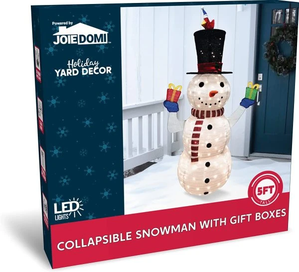 Bring the snowman inside your house for a festive display this holiday season with this collapsible snowman. This snowman features light-up features and ground stakes. A great addition to your home decor or a wonderful gift for the holidays! This snowman is a fun, festive way to add light and color to your holiday decor. This lightweight, easy-assembly display uses LED lights that are safe and energy-efficient use. It has ground stakes for securing a ground placement. Please read the safety instructions manual before use.
