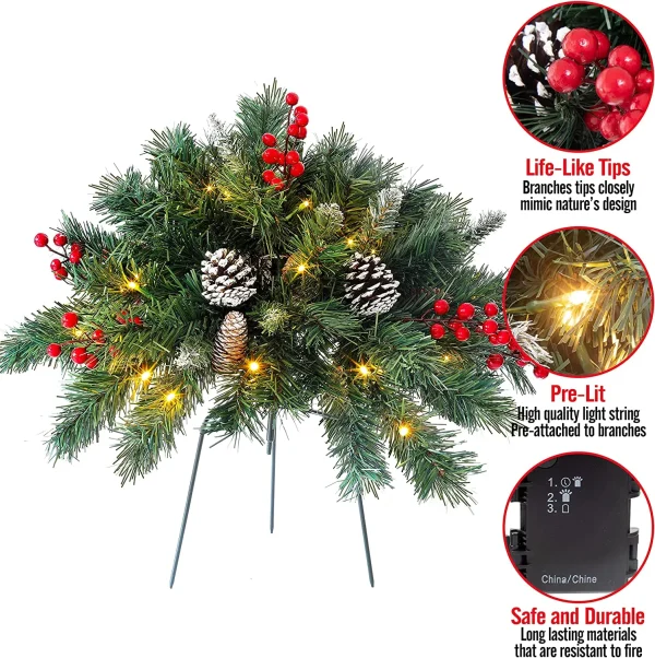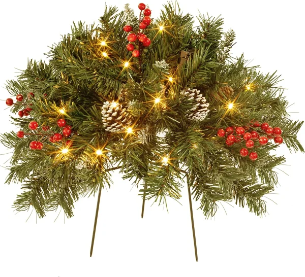 Christmas urn fillers is trimmed with pine cones, red berries, and 35 battery-operated warm white LED lights and is designed for filling decorative urns and pots. This decorative filler, with its crush-resistant branch construction, can be placed in an urn base or a container to brighten up the festive atmosphere in your home. The pot decor is made of non-allergenic, fire-resistant material. This realistic planter can be used indoors or outdoors and makes an excellent accent piece for a doorway, deck, porch, or patio. A 3-prong metal stake is included for supporting the filler in an empty container or inserting it into the soil. For use as an indoor or covered outdoor display.