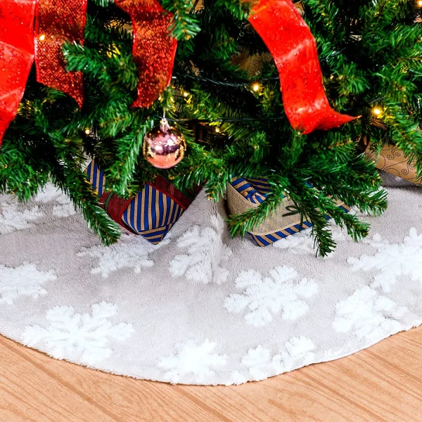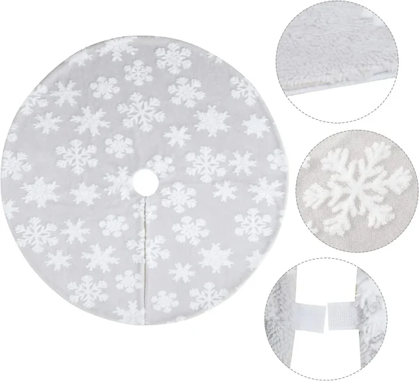The faux snow tree skirt is the perfect way to finish off your Christmas decorating! This 48-inch-long Christmas jacquard cashmere falling snow tree skirt pattern includes a 1-piece tree skirt. Our tree skirt is artistically created to enhance the holiday decor atmosphere of your Christmas tree. Additionally, the Velcro closures are correctly positioned, and the edges have been neatly stitched to keep the tree skirt in place. Impressively styled to add life and cheer to your Christmas. Just place this mat beneath your tree to finish off your winter holiday decor. Put the rest of your decorations on top of this skirt and don’t worry it will blend in beautifully with them. Constructed from strong, premium fabric materials. This is child safe, non-toxic, and odorless!