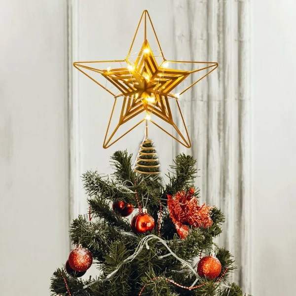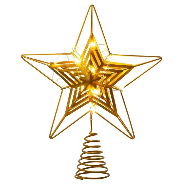 • This gold star Christmas tree topper adopts a traditional 5-pointed gold hollow star lighted with Warm White LED lights. An ideal choice to decorate your Christmas tree! The Gold Star tree topper is a size 9.5 inch * 12 inch, which is a perfect fit for a 6ft to 7ft Xmas tree.